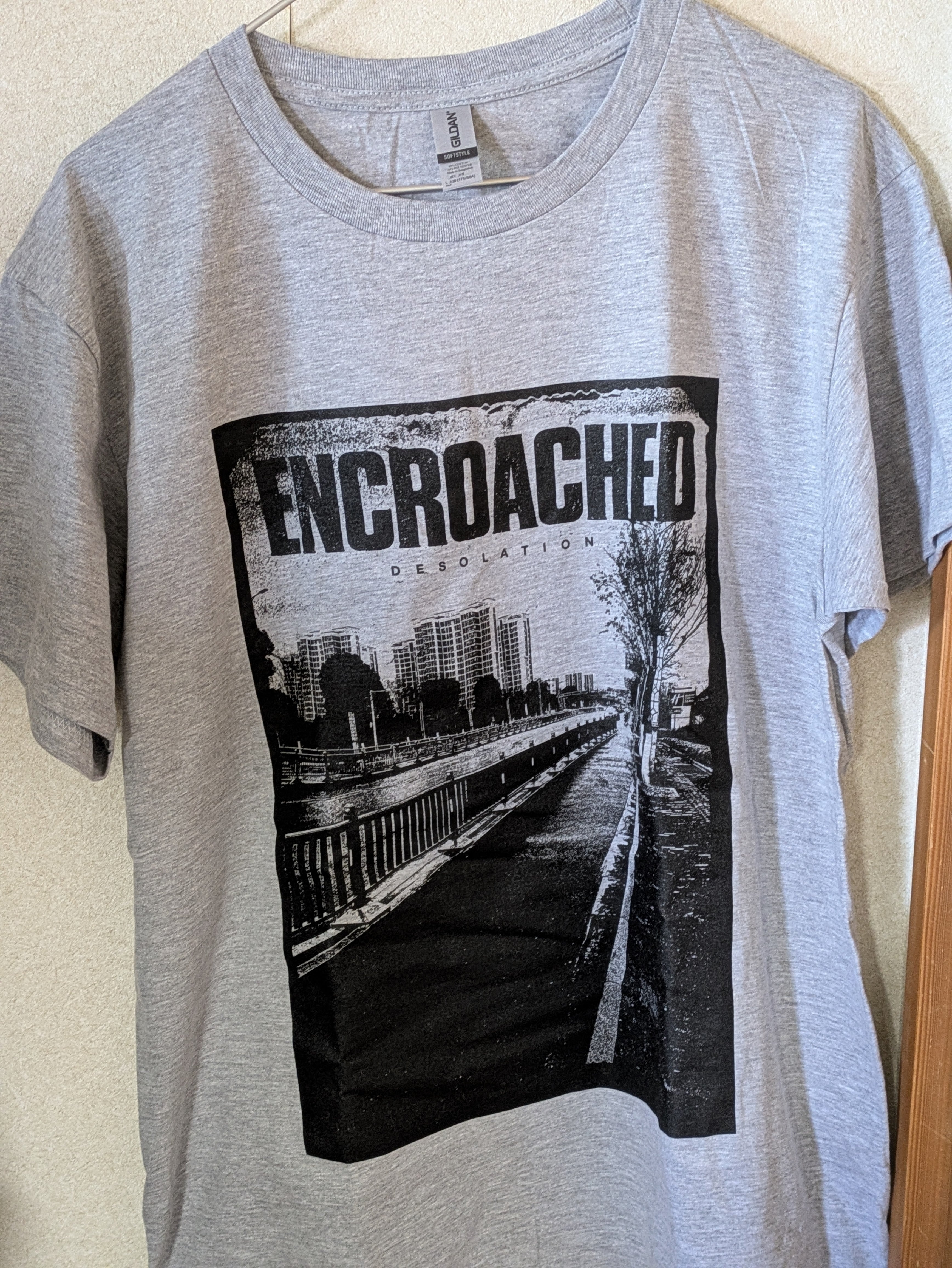 完売状態でしたのでENCROACHEDのTシャツをNEWデザインで少量作成しました。写真撮影は私、デザインはAndy Darlstom(Satanic Surfers)で無機質(DESOLATION)な風景がモチーフとなっております。ボディはGUILAN(S/M/L)白、黒、グレーになります。
